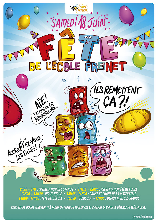 L’affiche de la fête de l’école Freinet est prête ! Samedi 18 juin à Hérouville Saint-Clair, ça va dézinguer de la conserve !!! Bonzaï !